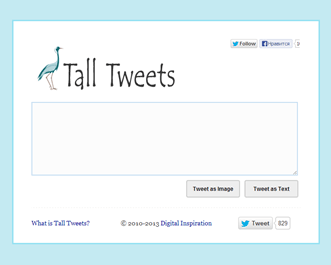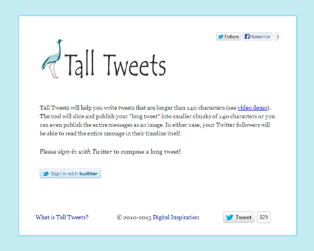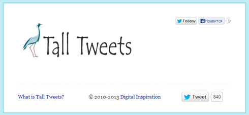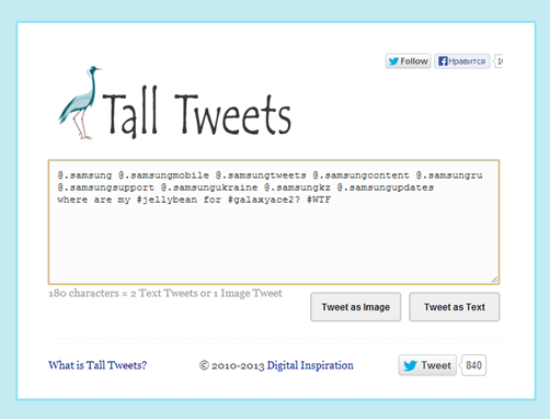 90 минут для аудиокассет, 180 минут для видеокассет, 1,44 мегабайт для дискеты, 700 мегабайт для диска, 160/70 символов на смс, 140 символов на твит – доколе можно терпеть цифровые ограничения! Сервис talltweets.com хоть и не так кричаще, но все же предлагает не ограничивать себя в длине твиттер-сообщения. Пусть данный ресурс не единичен на просторах сети (можно упомянуть хотя бы TwitLonger.com), но выделяется на общем фоне особой функциональностью. Но об этом чуть позже. По ходу рассмотрения сервиса также вскользь коснемся и морально-этической, идеологической стороны обхода установленного ограничения по длине твита. Итак, поехали!