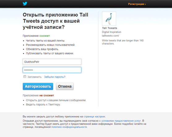 Предлагается войти под учетной записью твиттера (при этом сервис предупреждает особо пугливых о неприкосновенности их данных), чему мы и последуем: