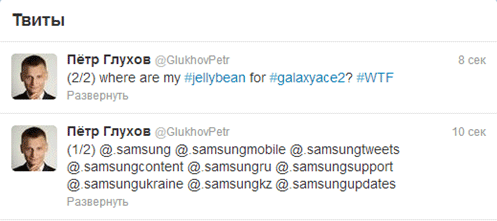 Как видно из скриншота, сообщение разбивается на соответствующее количество отдельных твитов и публикуется от первого к последнему снизу вверх. Достаточно удобно уместить всех адресатов в первые 140 символов, а текст послания оставить на второй твит (см. скриншот).
