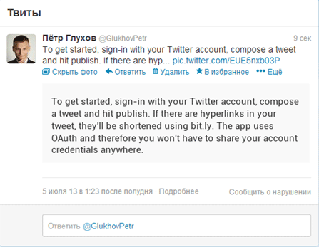 Немного о грустном. О выборочности работы сервиса. За короткое время пользования я так и не понял, почему часть твитов не отправляется, а часть с болью и хромотой – да. Пробовал на разных компьютерах и с использованием различных браузеров, но загадку так и не решил. Просьба поделиться в комментариях по этому поводу, если кто-то отследит причину. Есть подозрение, что дело в copy/paste отправляемого текста, т.е. если текст набирать непосредственно в окошке сервиса, а не вставлять его из текстового редактора, то проблем быть не должно. Наличие проблемы с публикацией можно отследить по виду окошка после отправки сообщения.
